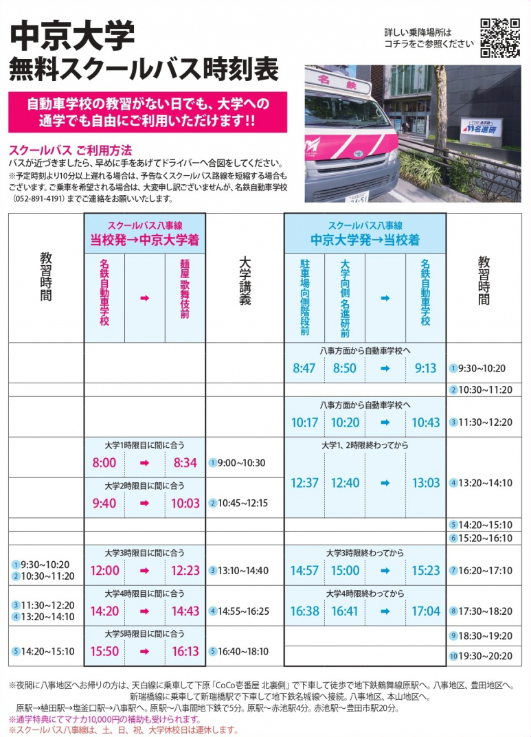 このたび、当校のスクールバス八事線が増便し、当校から中京大学へ通学できるようになりました!