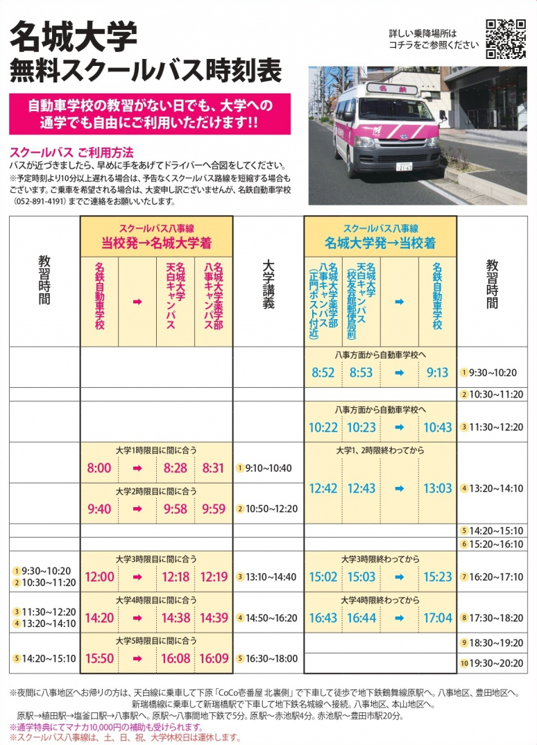 このたび、当校のスクールバス八事線が増便し、当校から名城大学へ通学できるようになりました!