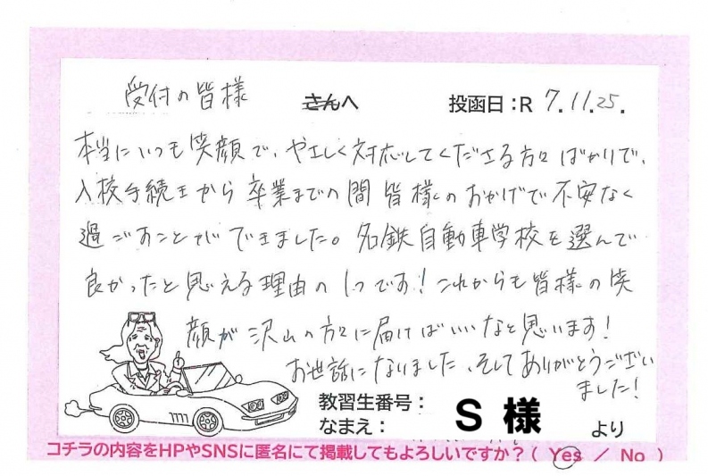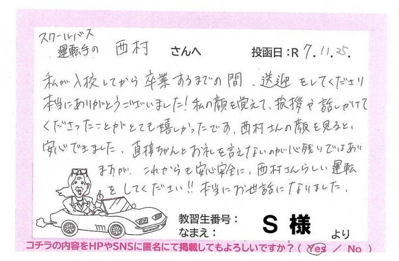 S様にとって受付スタッフの対応や西村ドライバーの送迎で、楽しく、安心して自動車学校へ通学できたこと、私たちも嬉しく思います✨(*^▽^*)✨