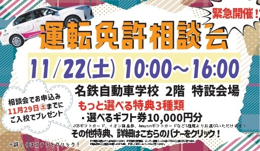 緊急開催!【 11 月 22 日(土)】当校 特設会場にて運転免許相談会を開催します!!