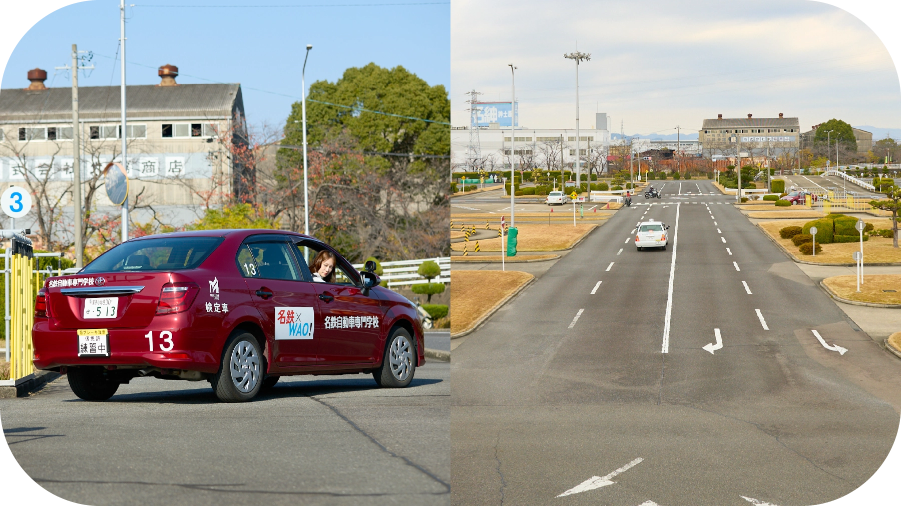 名鉄自動車学校 犬山では、広々とした敷地内でのびのび運転練習ができます。交通量のある幹線道路に近い立地で、実践的な路上教習が可能です。運転がはじめての方、運転に不安がある方もしっかりと運転練習ができます!