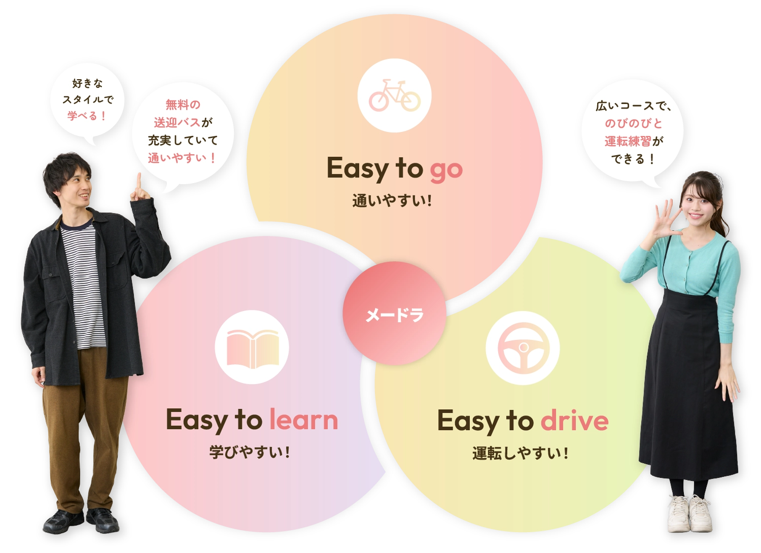 ご自宅付近までの「予約制送迎バス」、駅、大学とメードラを結ぶ定期便送迎バス、名鉄電車で通学する場合の定期代全額負担があり、オトクに通えます!「自宅から」「学校から」「バイト先から」など、生活スタイルに合わせて通学可能です。ムリなく通える環境が整っています。